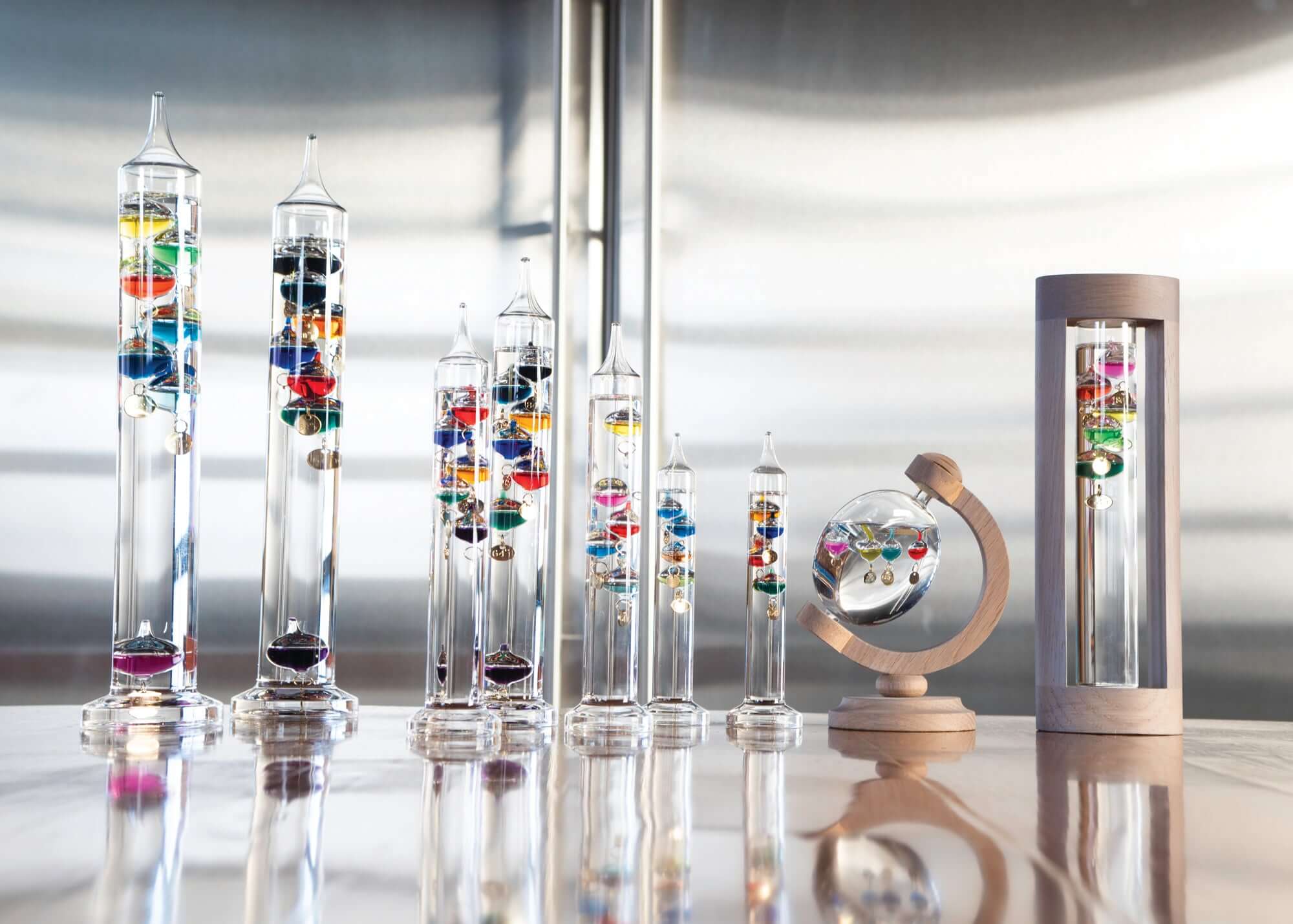 Based on a thermoscope invented by Galileo Galilei in the early 1600s, these stunning thermometers tell the temperature with colorful glass bubbles.